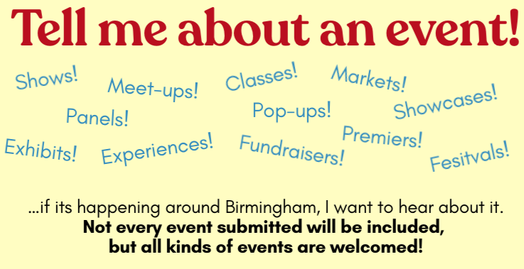 Subscribe to get Your Week in Birmingham in your inbox every Monday morning. First Name Last Name Email Address Subscribe! Check your email! Email Hattie for more info!